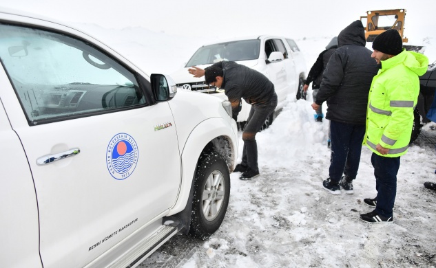 Yer yer 50 santimetreye ulaşan kar kalınlığı nedeniyle trafiğe kapanan yolu açarak ilerleyen ekipler, tam 9 saat süren yol açma ve kurtarma çalışmasının ardından bölgeye ulaştı.
