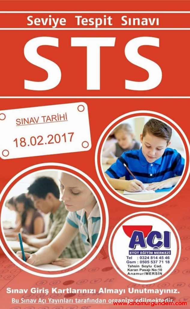 Anamur Açı Eğitim Kurumları 18 Şubat Cumartesi günü 3,4,5,6 ve 7 sınıf öğrencilerinin katılımı ile seviye tespit (bursluluk) sınavı yapacak.