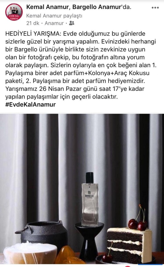 Yarışmanın detaylarını sosyal medya hesabından duyuran yetkili Kemal Atik şu ifadelere yer verdi.;HEDİYELİ YARIŞMA: Evde olduğumuz bu günlerde sizlerle güzel bir yarışma yapalım. Evinizdeki herhangi bir Bargello ürünüyle birlikte sizin zevkinize uygun olan bir fotoğrafı çekip, bu fotoğrafın altına yorum olarak paylaşın. Sizlerin oylarıyla en çok beğeni alan 1. Paylaşıma birer adet Parfüm+Kolonya+Araç Kokusu paketi, 2. Paylaşıma bir adet Parfüm hediyemizdir. Yarışmamız 26 Nisan Pazar günü saat 17’ye kadar yapılan paylaşımlar için geçerli olacaktır. #EvdeKalAnamur