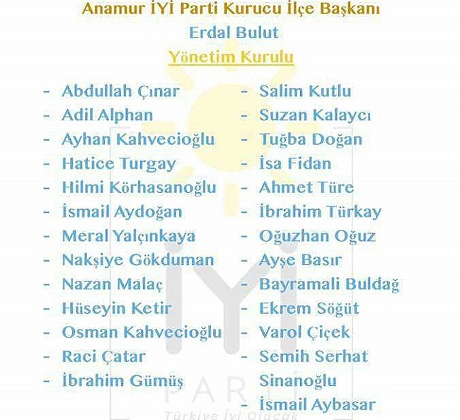 Önümüzdeki günlerde açılışı yapılması için hazırlıkların tamamlandığı ilçe binasında kamuoyuna tanıtılacak İyi Parti Anamur İlçe yönetiminde şu isimler yer alıyor.
