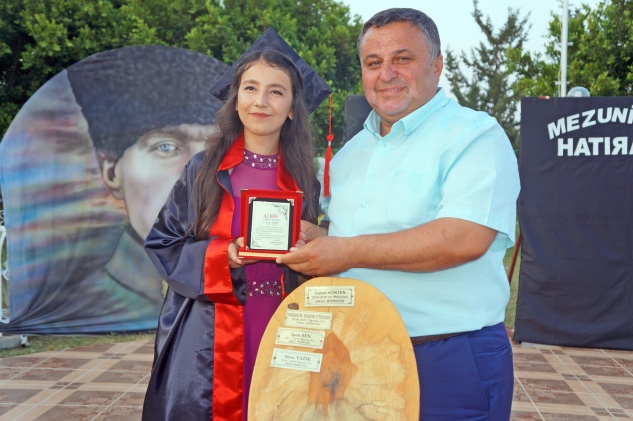 Alıçlı’nın konuşmasının ardından 2018-2019 eğitim öğretim yılı okul birincisi Arzu Yazık, yaş kütüğüne dönem plaketini çaktı.