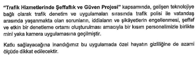 Emniyet Genel Müdürlüğü Strateji Geliştirme Kurulu tarafından uygulamaya konulan “Trafikte Şeffaflık ve Güven Projesi” kapsamında, trafik denetimlerinde görevli personele ses ve görüntü kaydı yapan yaka kameraları dağıtıldı.
