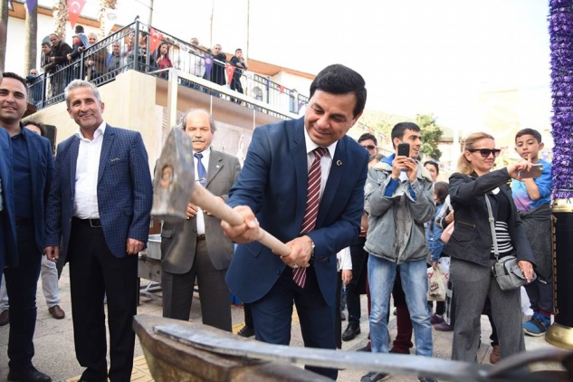 Muşurup Sanat Sokağı’ndaki etkinliğe katılan Belediye Başkanı Mehmet Türe ve beraberindekiler, Nevruz geleneğini yerine getirdi ve demir dövdü.