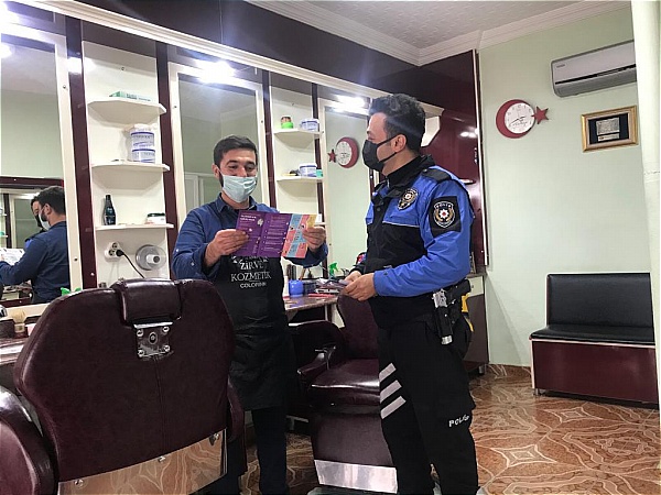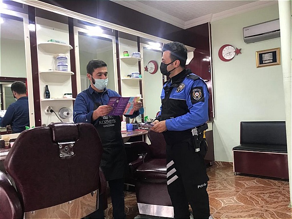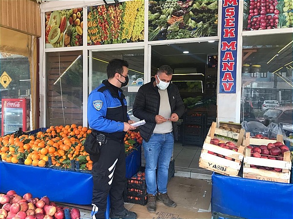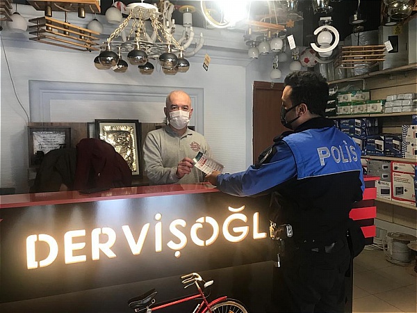 Esnaf ile vatandaşlara alınan tedbir kararları hatırlatan görevli polis memuru Orçun