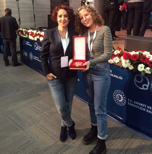 Pelin Yaşar, öğretmeni Nazan Akbulut ile birlikte Sanayi ve Teknoloji Bakanlığı’nın Ankara’da düzenlediği ödül törenine katılarak ödülünü Bakan Yardımcısı Hasan Büyükdede’den aldı.