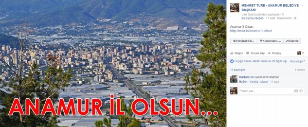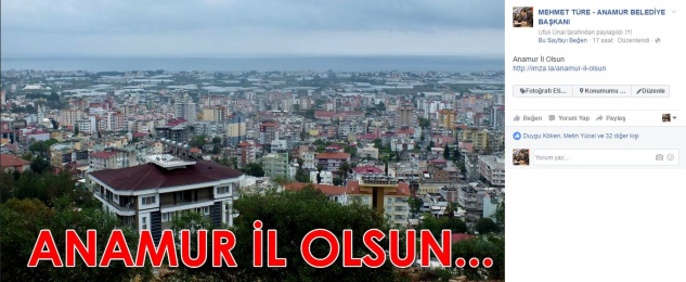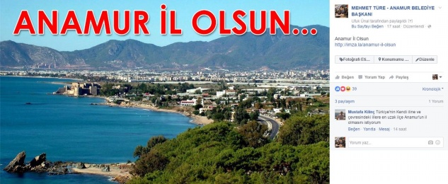 Yıllardır dile getirilen ancak bugüne kadar bir sonuç elde edilemeyen Anamur’un il olması konusu basında çıkan bazı haberlerde il olacak ilçeler listesinin yer alması ve Anamur Belediye başkanı Mehmet Türe’ye ait “Mehmet Türe-Anamur Belediye Başkanı’’ adlı resmi sayfada başlatılan “Anamur İl Olsun” adlı kampanya ile tekrar gündeme geldi.İl olacak ilçeler listesinde ismi ikinci sırada yer alan Anamur Türkiye’de iline en uzak ilçe olma özelliğinin yanı sıra çevre illere de uzaklığı ile biliniyor. Bu konudan rahatsız olan ve yıllardır hastalarını ile götürürken yollarda ambulanslarda kaybeden, resmi kurumlarda işleri dolayısıyla il merkezine yatılı olarak gitmek durumunda kalarak zaman ve ekonomik kayıp yaşayan Anamur Halkı kampanyaya sosyal medyada büyük destek verdi.