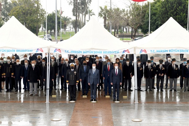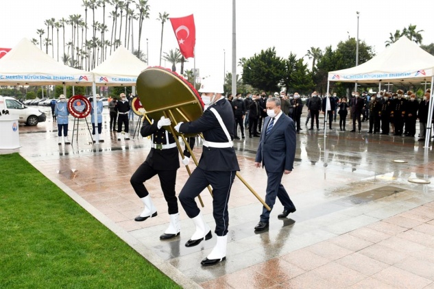 Atatürk Anıtına Mersin Valiliği, Akdeniz Bölge ve Garnizon Komutanlığı ve Büyükşehir Belediye Başkanlığı çelenklerinin sunulduğu tören, saygı duruşu ve İstiklal Marşı ile sona erdi.