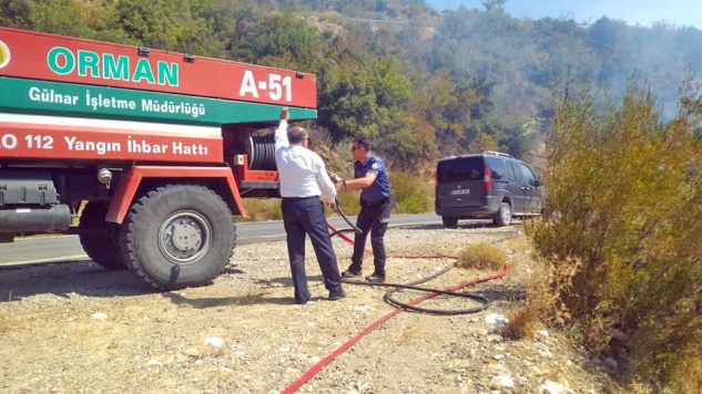 Bölgeye giden Aydıncık Kaymakamı Mehmet Erhan Türker de ekiplere, itfaiye aracından hortum çekerek yardımcı oldu.