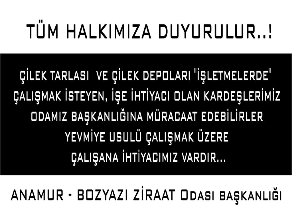Anamur Ziraat Odası Başkanı Ahmet Şeref Gümüş“Anamur Bozyazı ve civar bölgelerde bulunan işe ihtiyacı olan çalışmak isteyen vatandaşlara bir çağrıda bulundu. Başkan Gümüş’ün açıklaması şöyle;