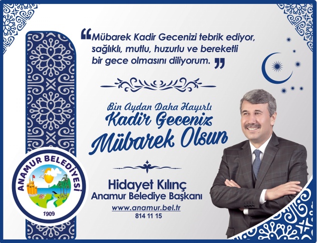 Anamur Belediye Başkanı Hidayet Kılınç Kadir Gecesi nedeniyle bir kutlama mesajı yayımladı.