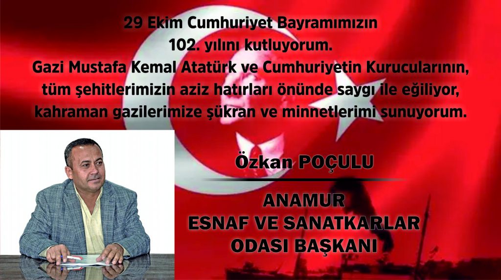 Poçulu , mesajının devamında şu ifadeler yer verdi, “ 29 Ekim 1923’te ilan edilen Cumhuriyetle birlikte Türk milletinin kaderinin değiştiğini vurgulayarak, “Bu tarihte Gazi Mustafa Kemal Atatürk’ün önderliğinde destansı bir kurtuluş mücadelesinin ardından çok zor şartlar altında kurulan Cumhuriyetimizi, sonsuza dek yaşatabilmek için her vatandaşımıza büyük bir sorumluluk düşmektedir. Bu bilinç ve kararlılıkla, vatanımızı kutsal bir emanet olarak büyük bir gurur ve onurla korumak için elimizden gelen her türlü çabayı göstermeye her zaman hazırız. Anamur  Esnaf ve Sanatkarlar olarak da bizler, güçlü bir gelecek için birlik ve beraberlik içerisinde daha çok çalışarak, daha çok üreterek ve ülkemizin kalkınmasına katkı sağlayarak üzerimize düşen görevi yapıyor ve yapacağız.