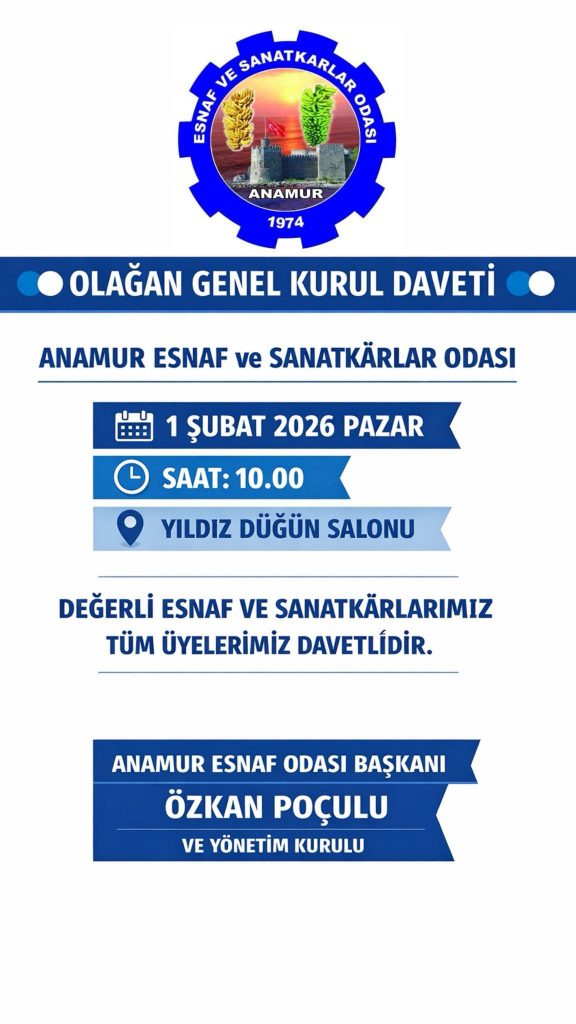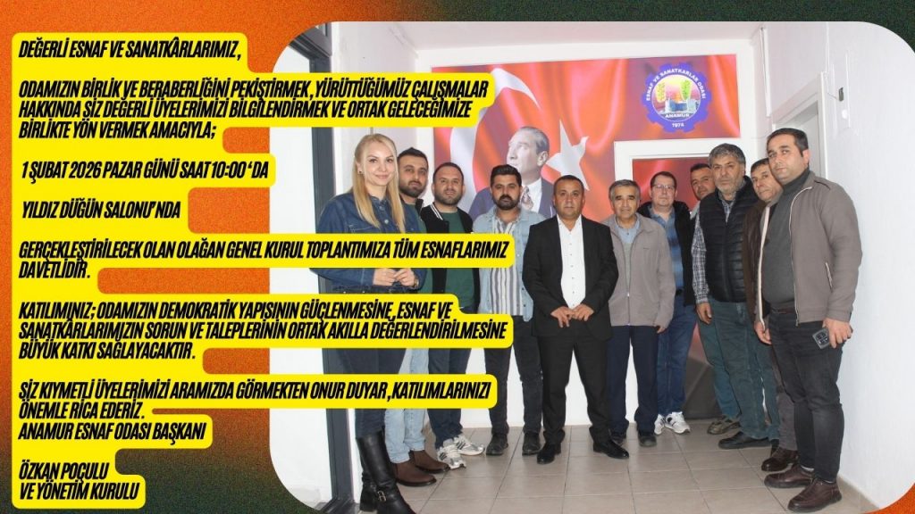 DEĞERLİ ESNAF VE SANATKÂRLARIMIZ,ODAMIZIN BİRLİK VE BERABERLİĞİNİ PEKİŞTİRMEK, YÜRÜTTÜĞÜMÜZ ÇALIŞMALAR HAKKINDA SİZ DEĞERLİ ÜYELERİMİZİ BİLGİLENDİRMEK VE ORTAK GELECEĞİMİZE BİRLİKTE YÖN VERMEK AMACIYLA;📅 1 ŞUBAT 2026 PAZAR GÜNÜ SAAT 10:00 ‘DA 📍 YILDIZ DÜĞÜN SALONU’NDAGERÇEKLEŞTİRİLECEK OLAN OLAĞAN GENEL KURUL TOPLANTIMIZA TÜM ESNAFLARIMIZ DAVETLİDİR.KATILIMINIZ; ODAMIZIN DEMOKRATİK YAPISININ GÜÇLENMESİNE, ESNAF VE SANATKÂRLARIMIZIN SORUN VE TALEPLERİNİN ORTAK AKILLA DEĞERLENDİRİLMESİNE BÜYÜK KATKI SAĞLAYACAKTIR.SİZ KIYMETLİ ÜYELERİMİZİ ARAMIZDA GÖRMEKTEN ONUR DUYAR, KATILIMLARINIZI ÖNEMLE RİCA EDERİZ.ANAMUR ESNAF ODASI BAŞKANIÖZKAN POÇULUVE YÖNETİM KURULU