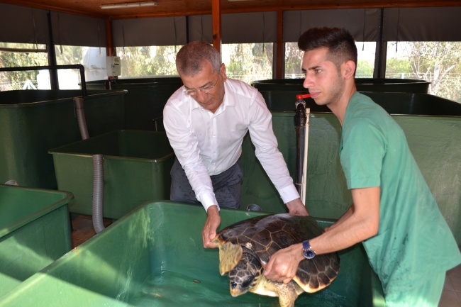 gündem012Mezitli Belediye Başkanı Neşet Tarhan, deniz kaplumbağalarına sahip çıkarak, rehabilitasyon merkezini ziyaret etti. Tarhan,”Çok geç olmadan,Deniz Kaplumbağalarına ve Eko sisteme sahip çıkalım”dedi.Mezitli Belediye Başkanı Neşet Tarhan,Kumsala atılan çöplerin  deniz kaplumbağa  yavrularının  denize ulaşmasını engellediklerini söyledi.  Başkan Tarhan, Mezitli Davultepe 100. yıl  plajı içinde yer alan deniz kaplumbağaları  rehabilitasyon  merkezini ziyaret etti.  Tarhan, açık denizlerde köpek balığı veya balıkçılık faaliyetlerinde  yaralanan deniz kaplumbağalarının tedavileri hakkında Orman ve Su İşleri Bakanlığı  Yaban Hayat  Milli Parklar Genel Müdürlüğü Mersin Şube Müdürü Ahmet Cortük’ten  bilgi aldı. sahile Deniz kaplumbağalarının üreme yaptığı kumsala çöp  veya plastik attıkları bırakılmasından kaplumbağaların zarar gördüğünü belirten Tarhan“Sahilde bırakılan çöpler yavru deniz kaplumbağaların denize ulaşmasını engelliyor ve ölümlerine neden oluyor. Eko sistemin korunması yönünde  en önemli unsurun insanların bilgilendirilmesi ve bilinçlendirilmesidir. Nesli tehlike altında olan  deniz kaplumbağalarının, diğer kara ve deniz canlılarının beraber korunması gerekir” dedi.Mersin ’de yaralı deniz kaplumbağalarının bakımı için kurulan farklı ebatlardaki 9 havuzun sularının günlük değiştirildiğini anlatan Cortük, yaralı deniz kaplumbağalarının bakımının bu  merkezde havuzlar için yapıldığını söyledi.Tekniker Veteriner hekim Hüseyin Akarık,  “Deniz kaplumbağalarının yaralanmaları daha çok misina dolanması ve kesmesi nedeniyle oluyor. Bunun yanında amatör balıkçılık oltalarındaki iğneler ve sürat motoru ya da tekne pervaneleri de deniz kaplumbağalarının yaralanmalarına ayrı bir etken. Bazen balıkçıların saldırısına uğramış deniz kaplumbağalarına da rastlıyoruz. Yaralanan deniz kaplumbağalarını merkezdeki havuzlarda tedavi ediyoruz ve canlı besinleri kendi başına yakalayacak durumu gelinceye kadar bakıyoruz. Sonra doğaya bırakıyoruz. Bugüne kadar merkezimizde tedavisi tamamlanan  22 deniz kaplumbağasının 16 doğal yaşamına bıraktık. 6 deniz kaplumbağasının tedavisi sürüyor” dedi.gündem013gündem014