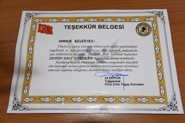 Zeytindalı Harekatı kapsamında sınır güvenliğimizi sağlamak üzere Suriye’de bulunan Türk Askeri’nin moral ve motivasyonunun arttırılması adına, Anamur Belediyesince verilen destekler nedeniyle Belediye Başkanı Mehmet Türe’ye 5’inci Zırhlı Tugay Komutanlığınca Teşekkür Belgesi verildi.