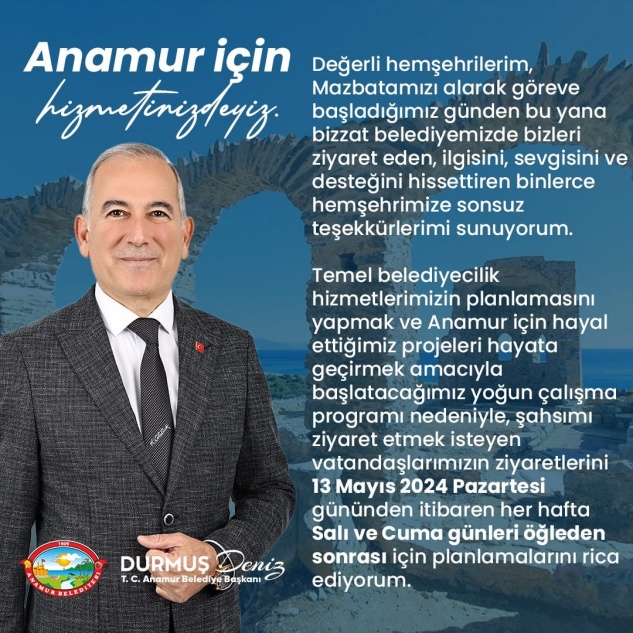 Anamur Belediye Başkanı Durmuş Deniz Salı ve Cuma günleri öğleden sonrasını halk günü olarak belirlediklerini duyurdu.