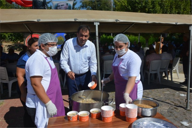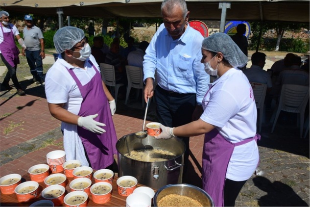 Kur’an okunması ve dua edilmesinin ardından Başkan Çetinkaya, Başkan Yardımcısı Ali deniz ve önceki belediye başkanı Mehmet Ballı, vatandaşlara aşure ikramı yaptı.