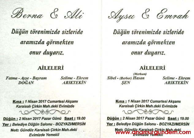 Bozyazı nüfusuna kayıtlı Ali ve Emrah Arıktekin kardeşler Doğan ailelerinin kızı Berna & Ali, Şen ailelerinin kızı Aysu& Emrah dün akşam Bozyazı Belediye düğün salonunda gerçekleşen görkemli bir düğünle yaşamların birleştirdiler.
