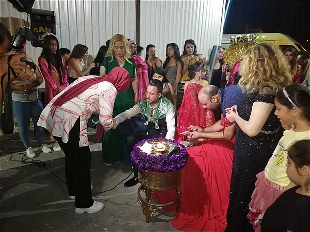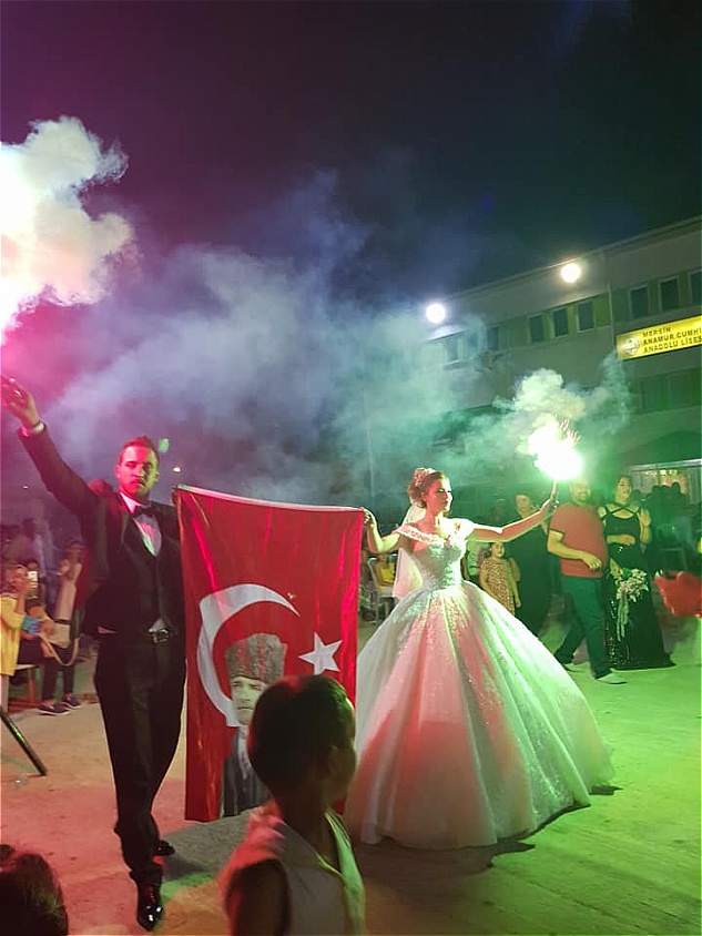 Cumhuriyet Anadolu Lisesi Bahçesinde düzenlenen düğün salonuna, onuncu yıl marşı eşliğinde Türk Bayrağı açarak, alkışlar arasında gelen Emine-Benhur çifti ilk danslarını yaptılar.
