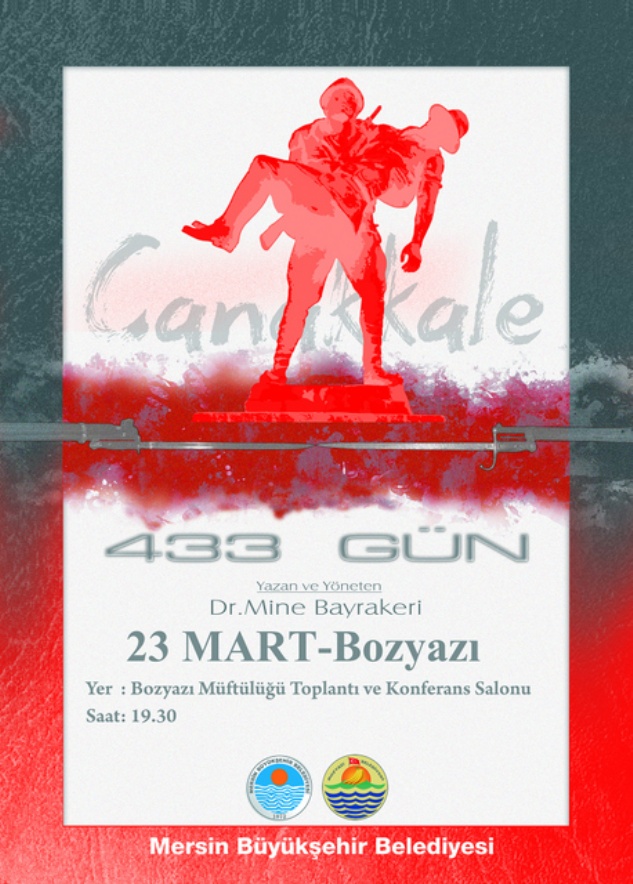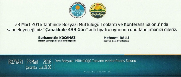 anamurgündme004anamurgündme002Çanakkale Zaferinin 101. yıldönümü münasebetiyle, 23 Mart  Çarşamba akşamı, saat 19.30’da,  Müftülük Konferans Salonunda sergilenecek “ÇANAKKALE 433 GÜN”  tiyatro oyununa  bütün vatandaşlarımız davetlidir.