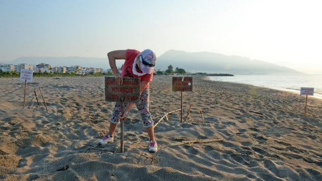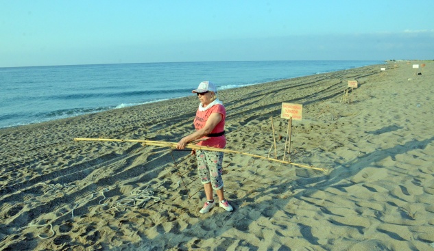 Anamurium Antik Kenti ile Mamure Kalesi arasındaki 13 kilometrelik kumsala geceleri çıkan anaç kaplumbağaların yumurta bıraktığı yuvalar, Milli Parklar Mühendisliği görevlisi ve gönüllü Ayşen Belpınar tarafından korumaya alınıyor.