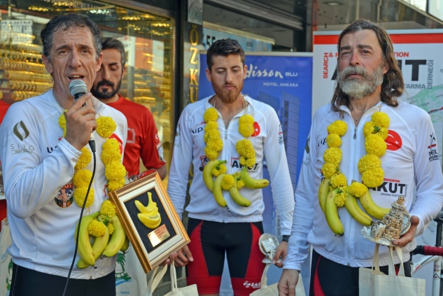 Anamur’un girişindeki Pullu mevkisinde AKUT Mersin Ekip Lideri Doğan Göktekin ve Anamur Belediyesi Kültür ve Sosyal İşler Müdürlüğü Yetkilisi Fatma Çetinkaya tarafından karşılanan sporculara muz ikram edildi.