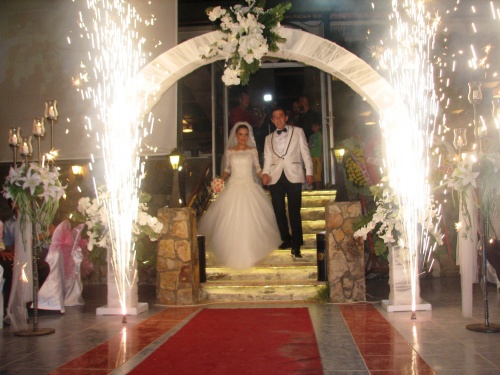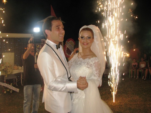 Gelin ve damadın salona gelişi sırasında havai fişekler ve konfetilerin ardı ardına atılması ile ilk danslarını yapan çiftin mutlulukları gözlerinden okunuyordu.
