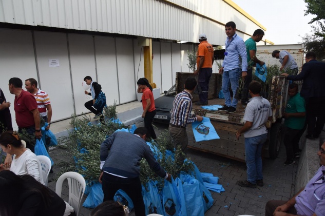 Fuar alanındaki zeytin fidanı dağıtımına vatandaşlar yoğun ilgi gösterdi. Belediye yetkilileri fuar süresince 4 bin zeytin fidanı dağıtılacağını kaydettiler.
