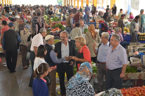 Gökçin Yalçın pazar esnafı ile pazara alış verişe gelen halkın elini tek tek sıkarak kendisini ve partisinin projelerini anlattı.