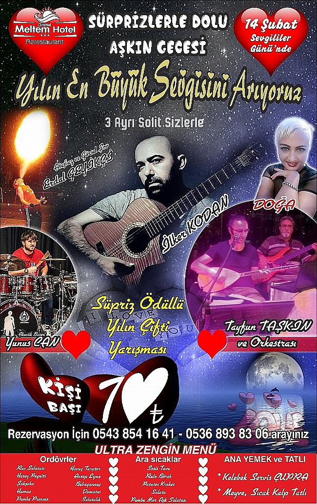 İçerisinde Akdeniz mutfağının yanı sıra, seçmeli yemek ve fix menü, Ocakbaşı restaurantta ızgara çeşitlerinin de bulunacağını ve bunların yanında canlı müzik programımızla siz müşterilerimize en güzel hizmeti vermeye hazırız. Yetenekli mutfak ekibimizle özenle hazırlanan menülerimizi denemek ve keyifli bir 14 Şubat akşamı geçirmek için hızlıca rezervasyon yaptırabilirsiniz. Gelmek sizden hizmet bizden diyerek Şarkılarda buluşalım
