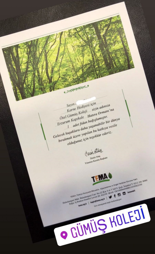 Özel Gümüş Koleji olarak çocuklarımıza KARNE HEDİYESİ olarak her çocuğumuz adına TEMA VAKFINA bağışta bulunarak her çocuğumuzun adına Erzurum Kapıkale Hatıra ormanına bir fidan bağışladık. Çocuklarımıza karneleri ile birlikte ömür boyunca anı olarak saklayabilecekleri sertifikalarını dağıttık.”
