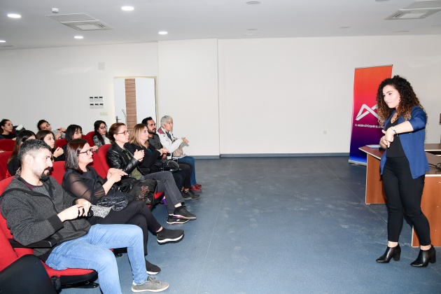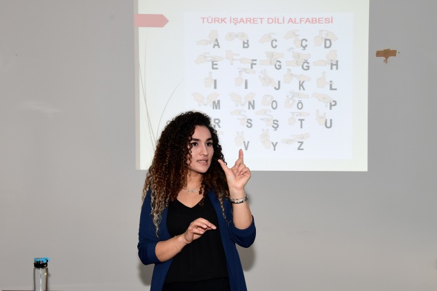 Katılımcılara işaret dilinden bahseden Alkan, işaret dilinin işitme engellilerin kendi aralarında iletişim kurarken el hareketlerini ve yüz mimiklerini kullanarak oluşturdukları bir görsel dil olduğunu belirtti. İşaret dilinde seslerin görüldüğünü ve zengin bir kelime haznesine sahip olduğunu vurgulayan Alkan, bu dilde jest ve mimiklerin en önemli unsur olduğunu ifade etti.