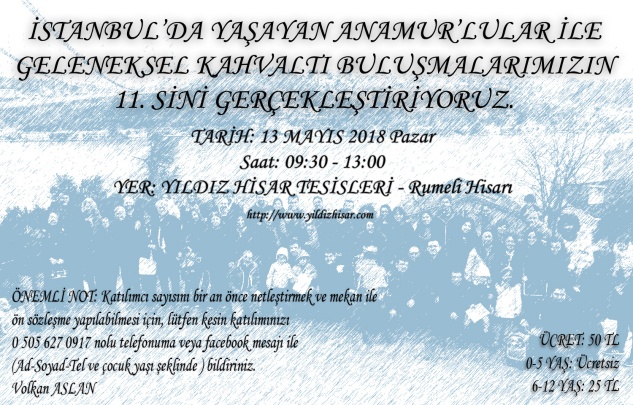Aslan, yaptığı yazılı açıklamada, 13 Mayıs 2018 Pazar günü, Yıldız Teknik Üniversitesi Hisarüstü tesislerinde gerçekleştirecekleri kahvaltıya Anamurluları davet ederken, katılmak isteyenlerin facebookta “istanbuldakianamurlular” ve twitterda “ISTanamurlular” adreslerinden kendilerine ulaşabileceklerini bildirdi.