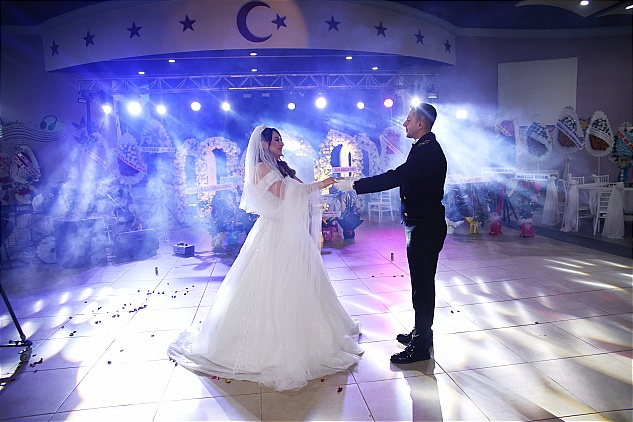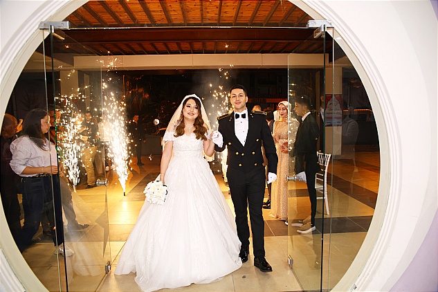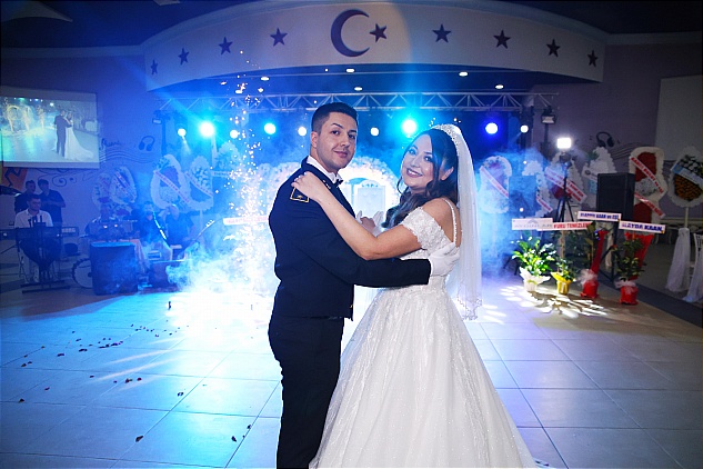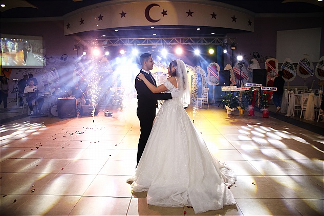Gelin ve damadın salona gelişi sırasında havai fişekler ve konfetilerin ardı ardına atılması ile başlayan gecenin ilk dansını yapan genç çiftin mutlulukları gözlerinden okunuyordu.