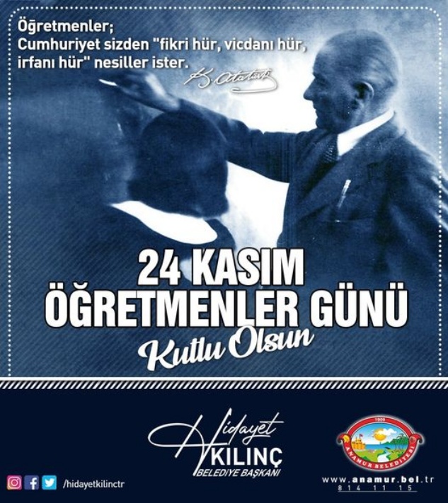 Anamur Belediye Başkanı Hidayet Kılınç, Öğretmenler Günü dolayısıyla yayımladığı mesajda, “Ülkemizin ve milletimizin geleceği olan çocuklarımızın eğitimi için hiç bir fedakarlıktan kaçınmayan öğretmenlerimizin 24 Kasım Öğretmenler Gününü kutluyor, sağlıklı, huzurlu ve başarılarla dolu bir ömür diliyorum” dedi.