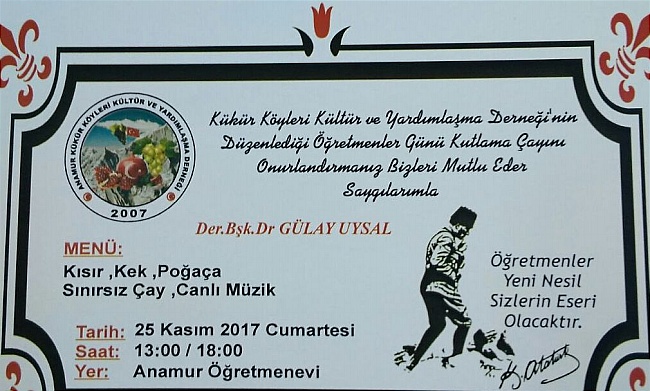 Kükür Köyleri Kültür ve Yardımlaşma Derneği Başkanı Dr. Gülay Uysal ve dernek üyeleri Her yıl geleneksel olarak düzenlenen Öğretmenler Günü etkinliği programını 25 Kasım 2017 Cumartesi günü düzenleniyor. Saat 13.00’da Öğretmen Evi’nde düzenlenecek olan Öğretmenler Günü etkinliği, canlı müzik eşliğinde; el yapımı kısır, kek, poğaça ve sınırsız çay ikramlarının olacak olduğunu ifade eden Kükür Köyleri Kültür ve Yardımlaşma Derneği Başkanı Dr. Gülay Uysal, tüm Anamur Halkını davet etti.