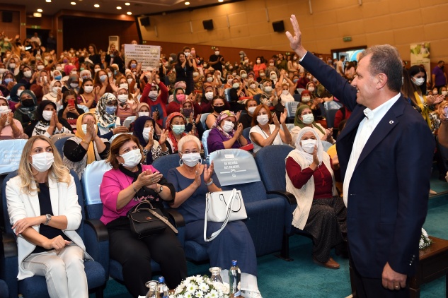 Etkinlikte konuşan Başkan Vahap Seçer, salonun enerjisinin çok yüksek olduğunu vurgulayarak, “Çünkü burada üreten insanlar var. Aslında kadın dediğiniz zaman boğazım düğümleniyor. Çok seviyorum kadınlarımızı. Ben ayrımcıyım. Ben kadınların tarafındayım, ben çocukların tarafındayım, birinin koluna girip kendisine destek olmasına ihtiyacı olanın yanındayım. Zaten güçlü ayakta duruyor, güçlünün bizlere ihtiyacı yok ama sizlerin var. Kadın çok anlam ifade ediyor. Kadın işçidir, kadın çiftçidir, kadın girişimcidir, kadın hayatın her alanında var. İşçidir, en ağır ev kadını, ev işçisi. Daha ağır iş var mı? Tarlada işçi, atölyede işçi, fabrikada işçi, bahçede, serada, ahırda, ağılda hem çiftçi hem işçi. Birkaç mesleği birden yapıyor ve girişimci” dedi.