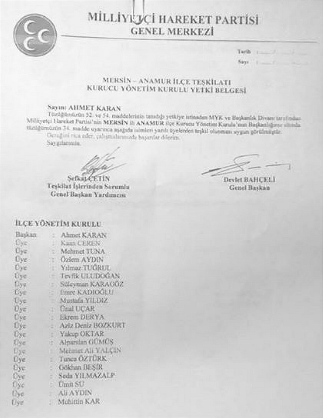 MHP Genel Merkezi tarafından yaklaşık 4 ay önce İlçe Başkanı olarak atanan İsmet Babahan’ın görevine son verilerek, MHP’li Anamur Belediye Meclis Üyesi Ahmet Karan Anamur İlçe Başkanlığı görevine getirildi.