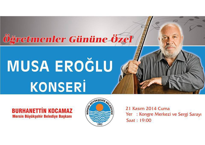 21 Kasım 2014 Cuma akşamı saat 19’da Mersin Büyükşehir Belediyesi Kongre ve Sergi Sarayı’nda gerçekleşecek olan ücretsiz Musa Eroğlu konserine, başta öğretmenlerimiz olmak üzere tüm Mersinli sanatseverleri davet eden Başkan Kocamaz, “24 Kasım Öğretmenler Günü’nden önce, geleceğimizin teminatı olan yavrularımızı emanet ettiğimiz değerli öğretmenlerimize küçük bir hediye olarak, yine Mersinli olan ve Devlet Sanatçısı ünvanını alan ünlü Türk halk müziği sanatçısı Musa Eroğlu’yu hemşehrileriyle buluşturuyoruz. İnşallah 21 Kasım 2014 Cuma akşamı hep birlikte, ünlü sanatçımızın seslendireceği türkülerle hem hüzünlenecek hem de coşacağız.” dedi.