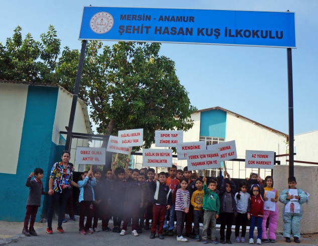 Sınıf öğretmeni Necla Aslan, öncülüğünde yürüyüş yapan 2C sınıfı öğrencileri, ellerindeki pankartlarla obeziteye karşı mücadele ve sağlıklı beslenmenin önemine dikkat çektiler.
