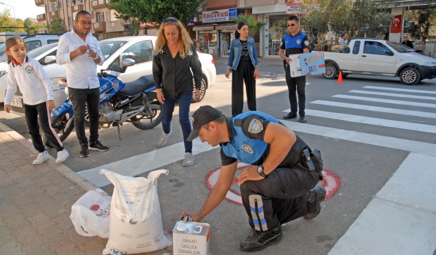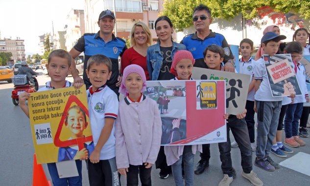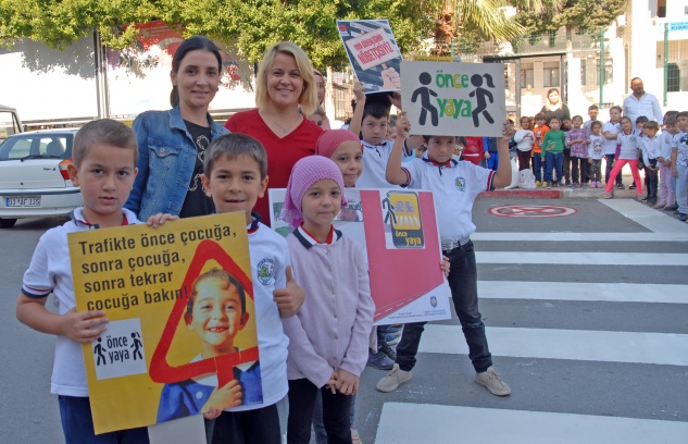Kıbrıs İlkokulu öğrencileri, Anamur İlçe Emniyet Müdürlüğü Toplum Destekli Büro Amirliği görevlileriyle birlikte okul önündeki kavşakta yaya geçidi oluşturdu.