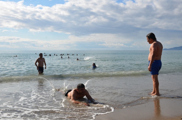 Buradan ayrılıp sahile gelen vatandaşlar, yeni yılın ilk gününde hem karda eğlenmenin hem de denize girmenin keyfini yaşadı.