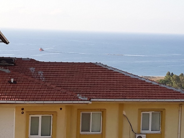 Bir vatandaşın TOKİ’den çektiği fotoğraflarda balık çiftliğine yönelik bir çalışma yaptığı izlenemini uyandıran gemi, bir günlük çalışmanın ardından bölgeden ayrıldı.