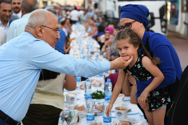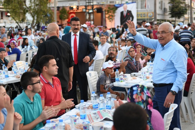 Bozyazı Cumhuriyet Meydanı’nda gerçekleştirilen iftar programı öncesinde alanda masaları tek tek dolaşan ve vatandaşların Ramazan-ı Şerifini kutlayan Mersin Büyükşehir Belediye Başkanı Burhanettin Kocamaz, Ramazan’ın 12. gününde iftarını Bozyazılılar ile birlikte yaptı.