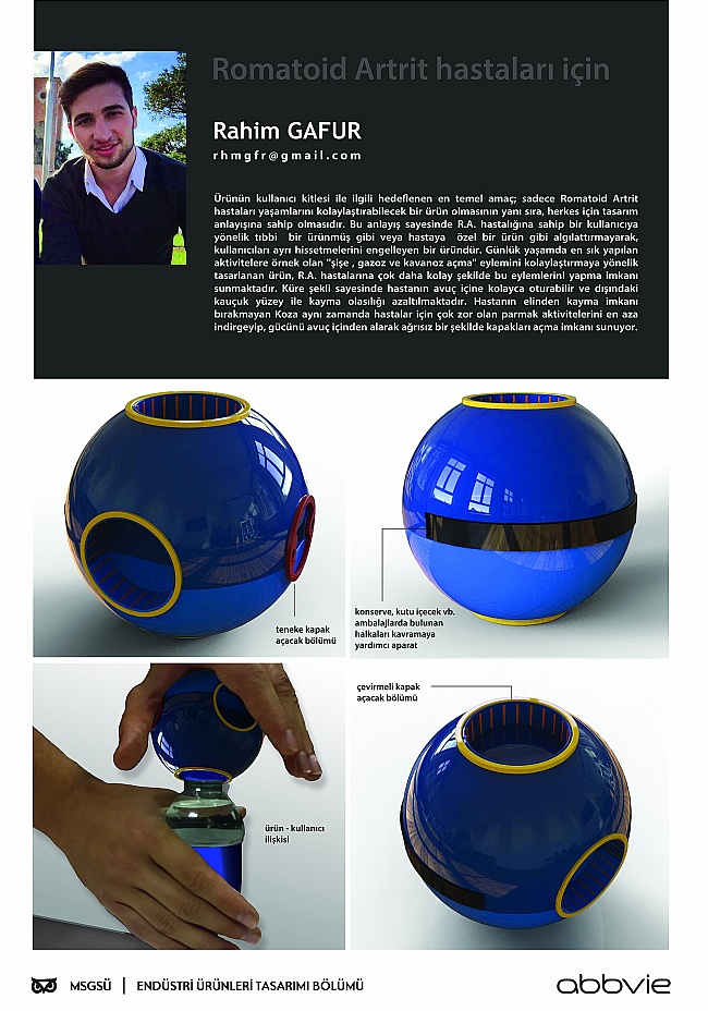 Romatoid artrit (RA) hastalığına dikkat çekmek amacıyla AbbVie’nin desteği ile Mimar Sinan Güzel Sanatlar Üniversitesi Endüstri Ürünleri Tasarımı Bölümü öğrencilerinin tasarladığı özel ürünler hastaların yaşam kalitesini yükseltmeyi hedefliyor. RA hastalarının günlük hayatlarında en çok zorlandıkları işleri kolaylaştırmak için özel şişe ve konserve kapağı açacağı üretildi. 12 Ekim Dünya Artrit Günü dolayısıyla RA hastalarıyla buluşacak
