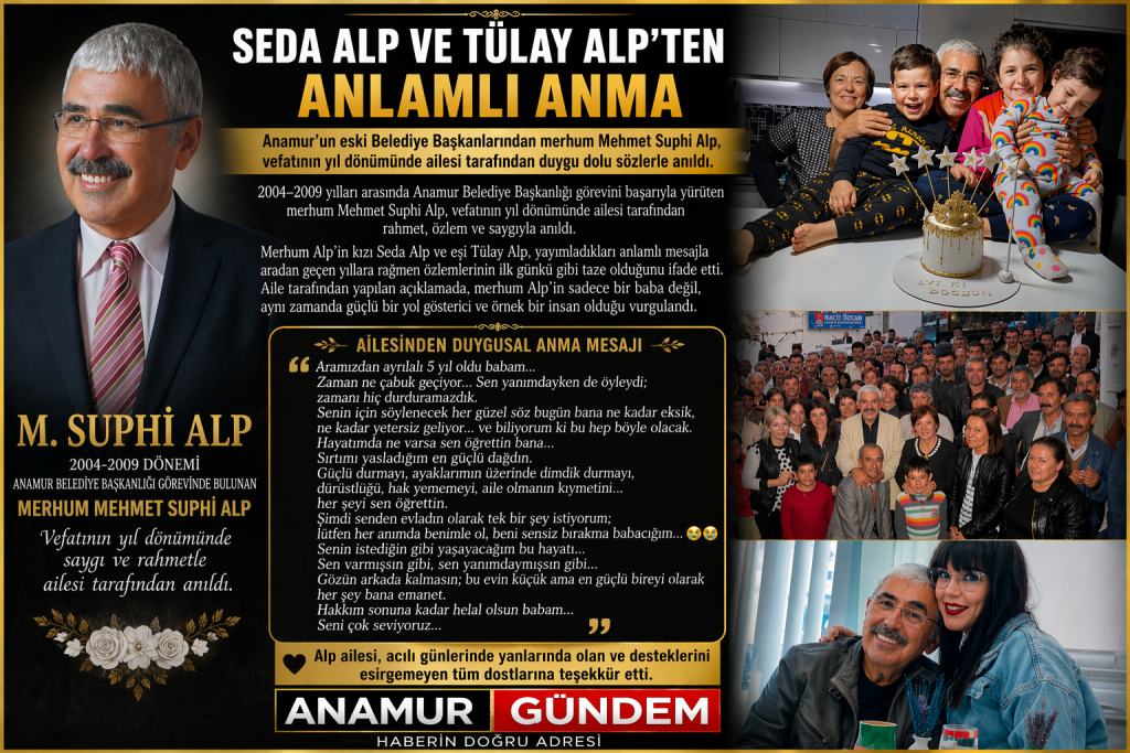 2004–2009 yılları arasında Anamur Belediye Başkanlığı görevini başarıyla yürüten merhum Mehmet Suphi Alp, vefatının yıl dönümünde ailesi tarafından rahmet, özlem ve saygıyla anıldı.