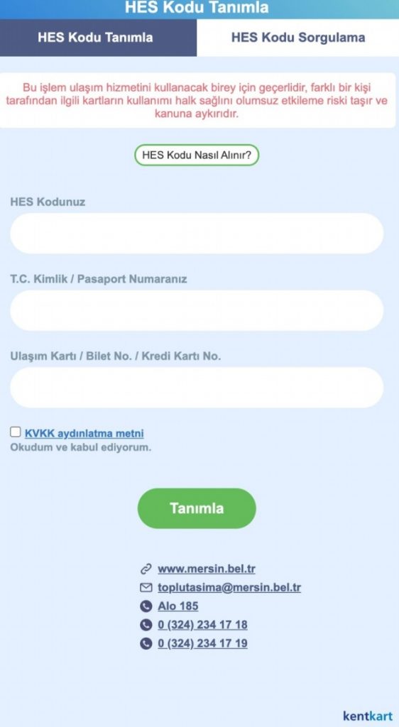 Büyükşehir’in toplu taşıma araçlarını kullanan vatandaşların kişiselleştirilmiş seyahat kartları ile HES kodunun entegrasyonunu sağlaması gerekiyor. Büyükşehir’e ait toplu taşıma araçlarını kullanan, Koronavirüs tanısı konulmayan ve temaslı olmayan kart sahibi vatandaşlar hes.mersin.bel.tr’yi ziyaret edip, gerekli adımları takip ederek otobüs seyahat kartları ile HES kodu entegrasyonunu sağlayabilecek. Bu adrese giren vatandaşlar açılan ekranda HES kodu, TC kimlik numarası/pasaport numarası, ulaşım kartı veya bilet numarasını girerek tanımla sekmesinden entegrasyonu gerçekleştirebilecek.