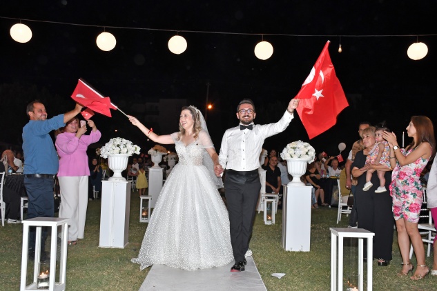 Alanda onlarca gencin konukların taleplerini almak için adeta seferber olduğu düğünde, masalara beyaz renkte balon ve Türk Bayrakları dağıtıldı. Binlerce balon gökyüzüne bırakıldı.