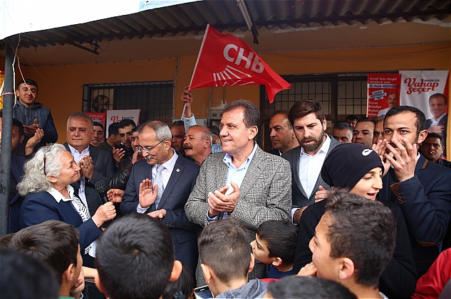 Daha sonra Tarsus’un yoksul mahallelerinden Fevzi Çakmak Mahallesi’ne geçen Vahap Seçer, burada partisinin Tarsus Belediye Başkan adayı Haluk Bozdoğan ile buluştu. Seçer ve Bozdoğan mahalle sakinleriyle selamlaşarak toplantının yapılacağı kahvehaneye kadar yürüdü.