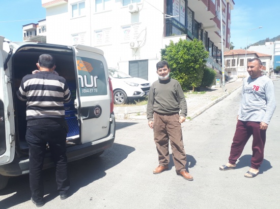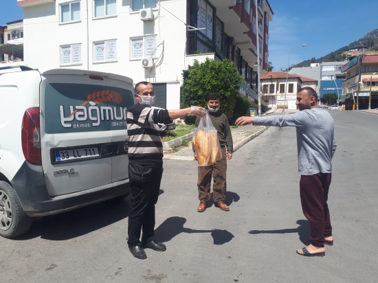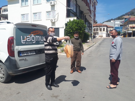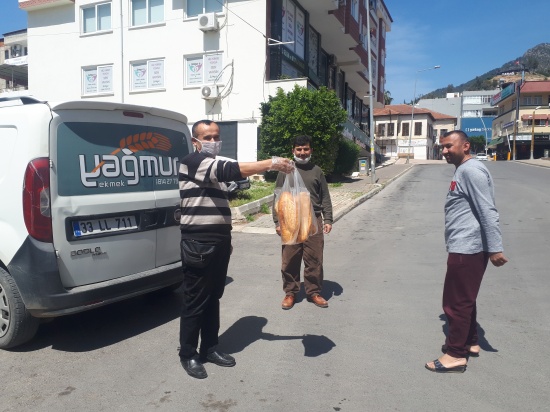 Koronavirüse (Kovid-19) karşı alınan önlemler kapsamında 30 büyükşehir ve 1 ilde getirilen sokağa çıkma yasağında Anamur’da da sıkı şekilde uygulanırken İlçede sokağa çıkamayan vatandaşların ekmek ihtiyaçlarının karşılanmasında dağıtımı bizzat mahalle mahalle gezerek kapı kapı vatandaşın hizmetini gören Yağmur Ekmek çalışanı Orhan Dönmez Saray mahallesinde verdiği ekmek hizmetinde mahalle muhtarı Tacittin Baz’da ona eşlik ederek halkın ekmeklerini temin etmesinde bizzat yardımcı oldu.