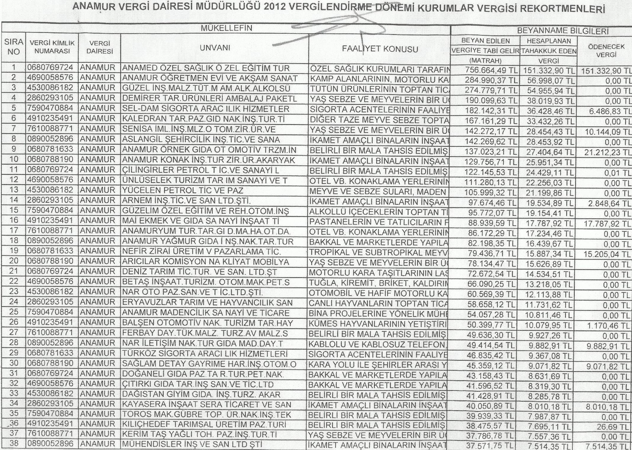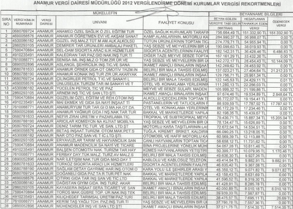 Vergi Dairesi Müdürlüğü’nün açıkladığı 2012 Kurumlar Vergisi Rekortmenleri listesinde ilk sırayı Özel Anamur Anamed Hastanesi alırken listede yer alan diğer kurumların isimleri şöyle:
